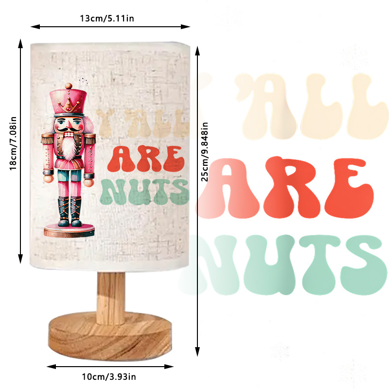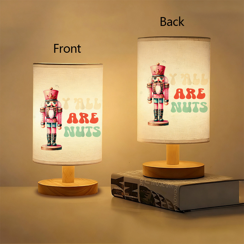 This All Are Nuts Print Linen Table Lamp brings a warm glow to your space. The printed shade features a festive nutcracker design. The artwork adds seasonal style to modern home decor. The uplight lighting method spreads light upward for a soft effect. This lamp works well for reading and quiet evening lighting.