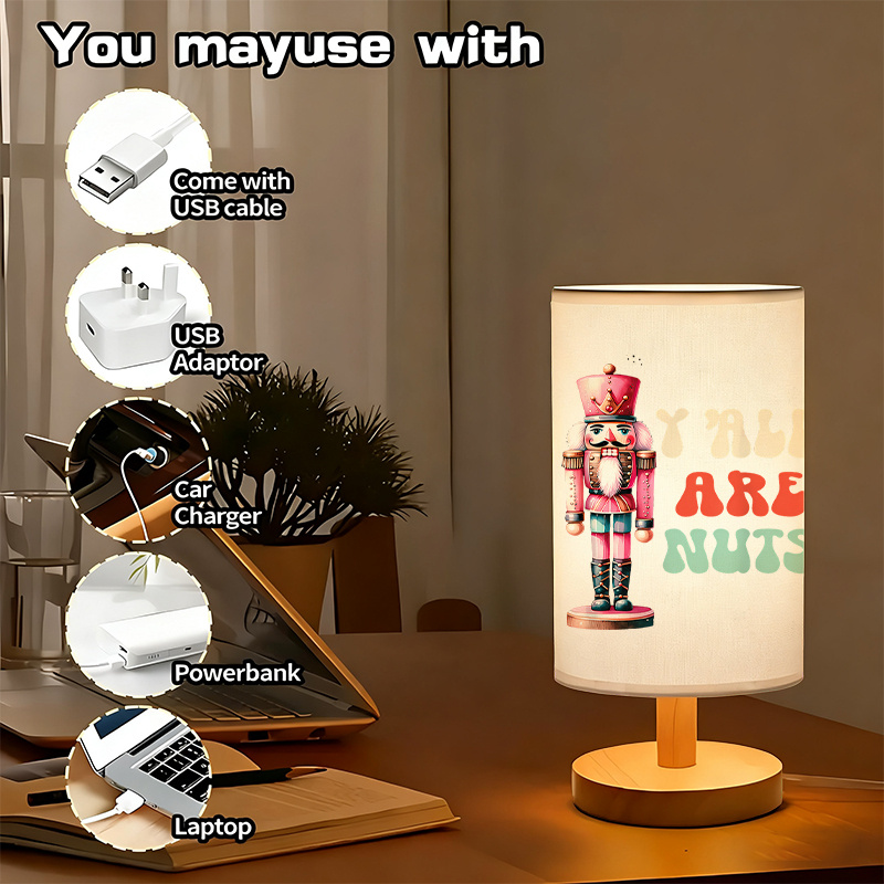 This All Are Nuts Print Linen Table Lamp is a modern lighting option for home decor. The linen shade features a festive nutcracker design for seasonal styling. The soft uplight glow supports ambient lighting for reading and daily use. USB plug-in power keeps setup simple with no batteries required. With button control and an included light source, it is ready for everyday lighting needs.