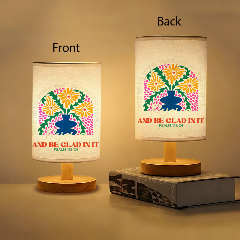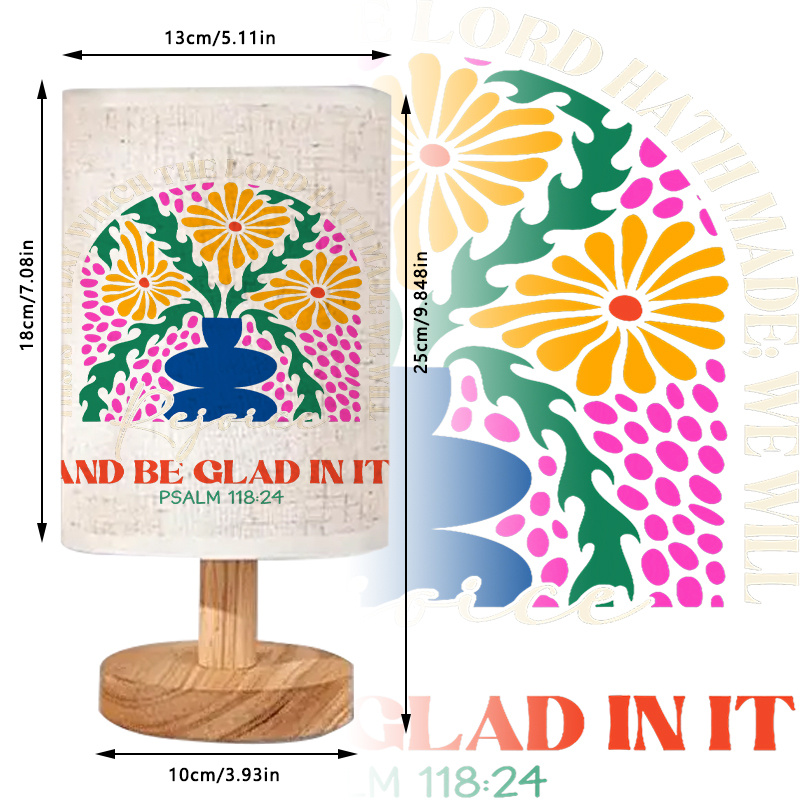 Bring decorative character to indoor spaces with this And Be Glad In It Text Print Linen Table Lamp With Floral Graphic. Designed with a modern aesthetic, this lamp combines a printed fabric shade with a smooth wooden base to create a balanced and visually appealing lighting option. The combination of text and floral artwork makes it suitable for bedrooms, living rooms, reading corners, and decorative tabletop displays.