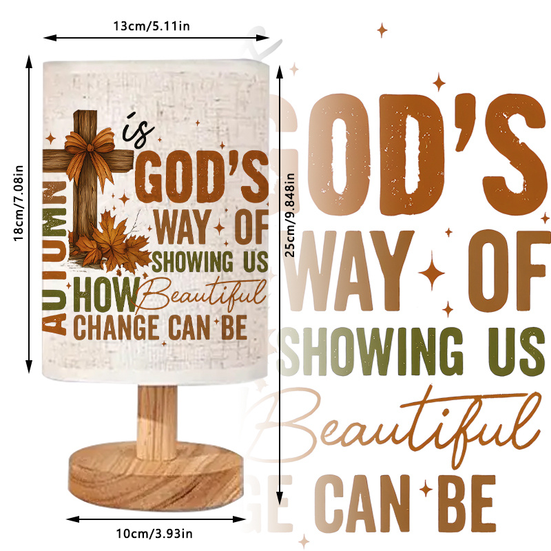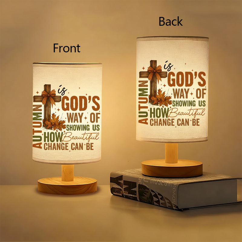 Autumn Themed Linen Table Lamp Base is a compact indoor tabletop lamp designed for everyday lighting and seasonal décor styling. This version features an autumn-themed printed message with leaf artwork on a linen-look fabric shade, creating an accent that fits bedrooms, living rooms, entryways, guest rooms, and home office spaces. The lamp is built around a round base for steady tabletop placement, while the fabric shade helps diffuse light for general indoor use.