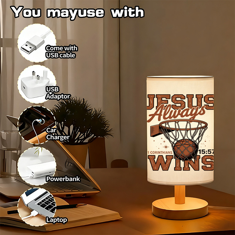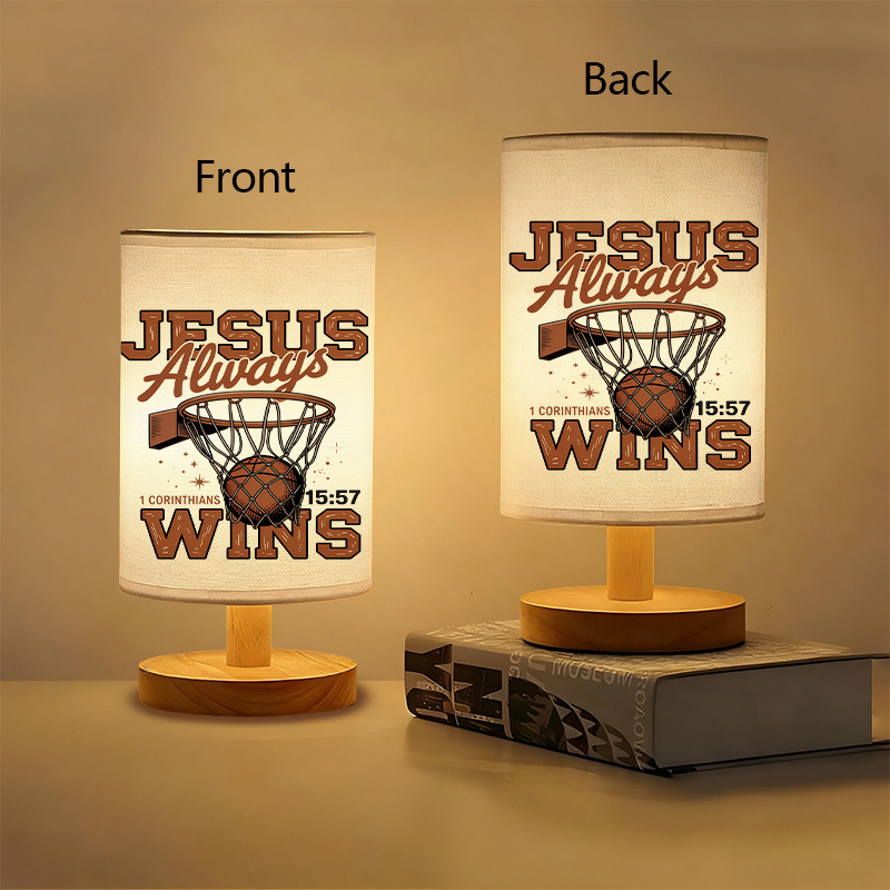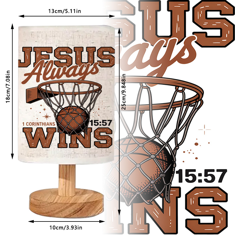The Basketball Inspirational Themed Table Lamp With Wooden Base And Sports Artwork combines function and meaningful visual design in one object. Its artwork includes a basketball hoop, printed lettering, and a well-known scripture reference from 1 Corinthians 15:57. This lamp offers visual structure for those who appreciate sports-themed decoration along with symbolic encouragement.