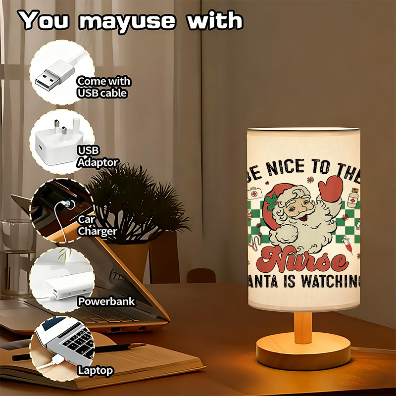 The Christmas Nurse Table Lamp blends seasonal visuals with everyday use. Its compact shape, printed theme, and fabric shade create a suitable display piece for informal or work-related spaces.