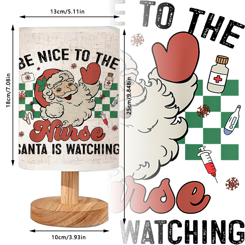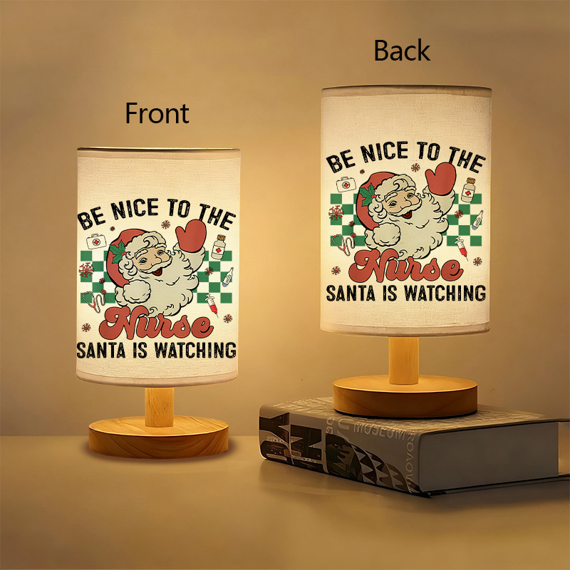 The surface includes printed words: Be Nice To The Nurse Santa Is Watching, paired with a visual layout that includes familiar seasonal elements and icons associated with professions. This table lamp works well for study spaces, desktops, side tables, or decorative settings in work environments.