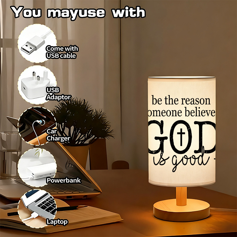 The Inspirational Printed Table Lamp contributes to simple, faith-based interior setups. Its quiet design features a message that remains clearly visible while light is active or inactive. The power source options allow flexible placement across multiple rooms or desks.