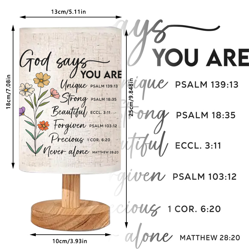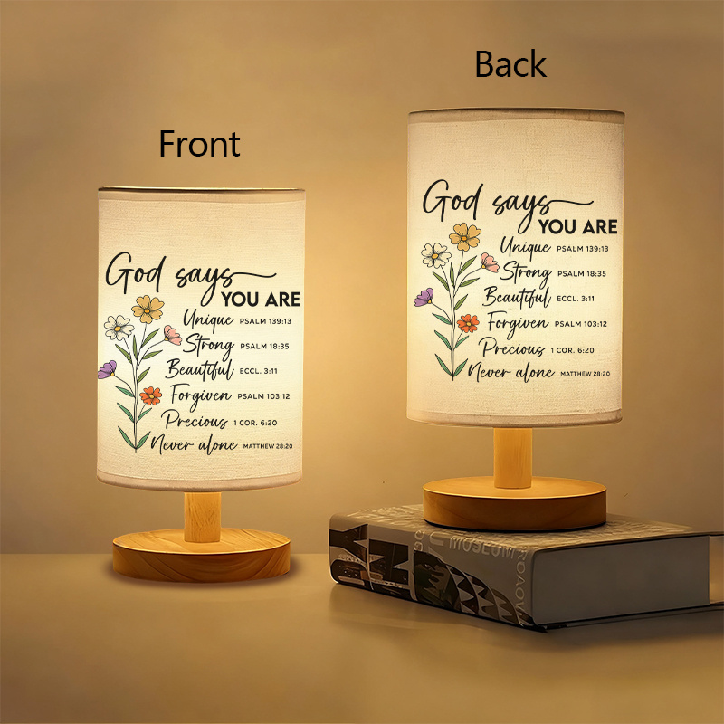 - Linen-style shade: Fabric shade with printed text and floral artwork for a decorative tabletop look
