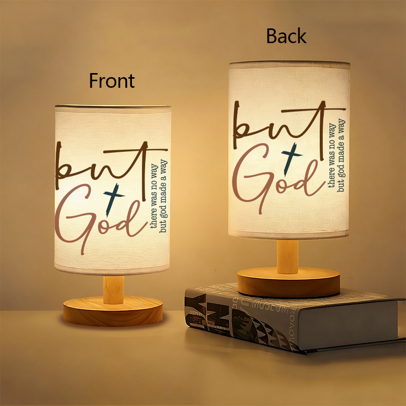 The But God Printed Linen Table Lamp With Inspirational Quote presents a quote-based message with minimal line artwork in a structured tabletop design. Its glow adds a consistent tone to personal spaces.