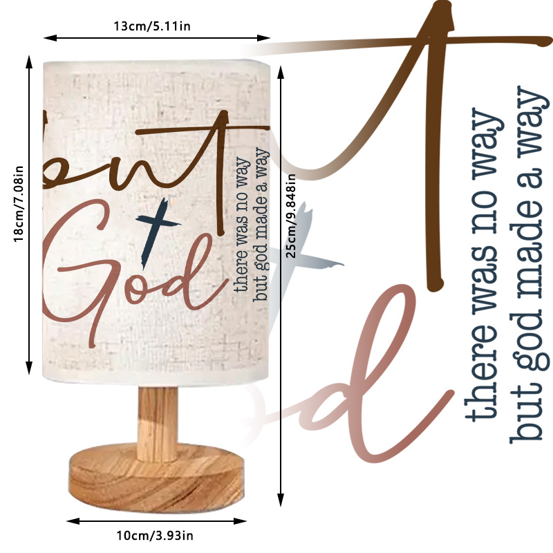 This item uses a fabric lampshade with structured dimensions and is supported by a cylindrical wooden base. The artwork includes the phrase Even God followed by an extended message across the lamp.