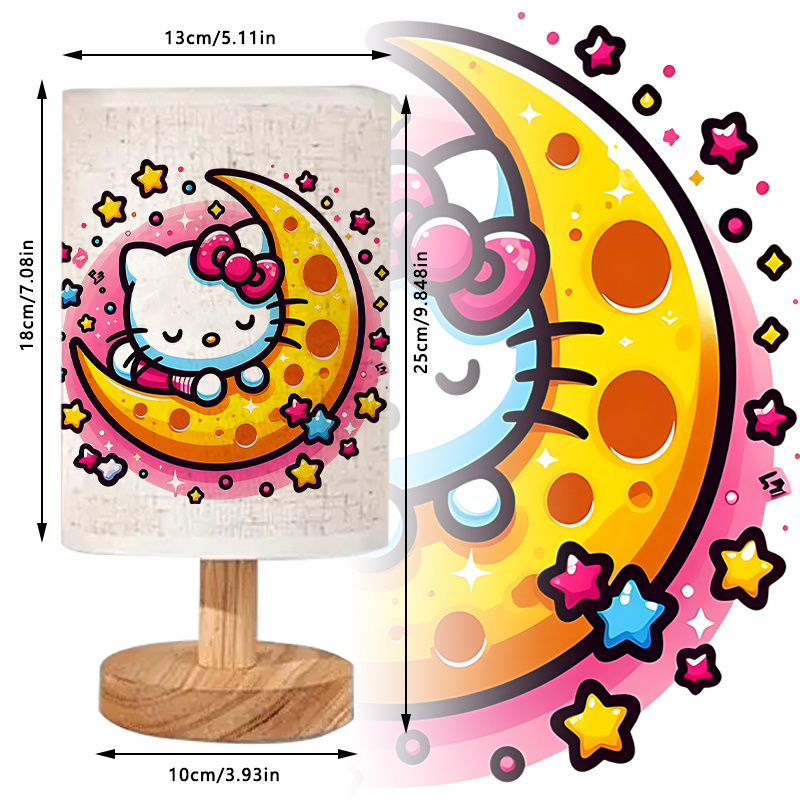 The Cartoon Cat Moon And Star Print Table Lamp With Wooden Base combines decorative simplicity with indoor lighting utility. Its printed shade shows an illustration of a character resting on a crescent moon, accompanied by surrounding stars. This visual design introduces a themed atmosphere suitable for personal or shared indoor spaces.