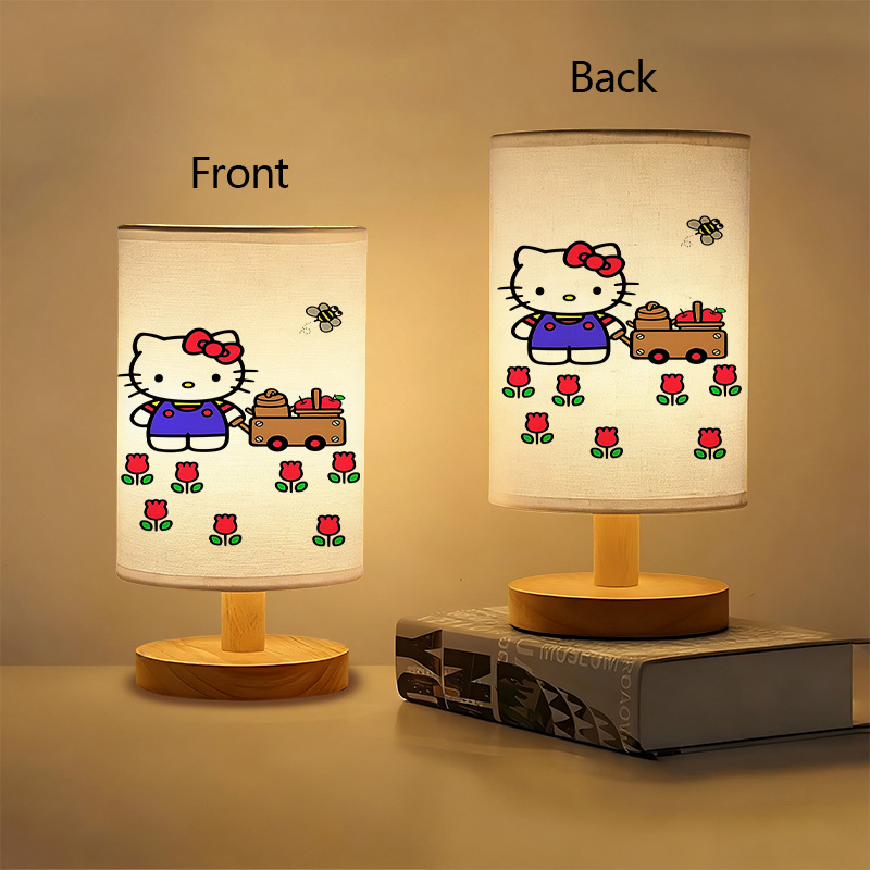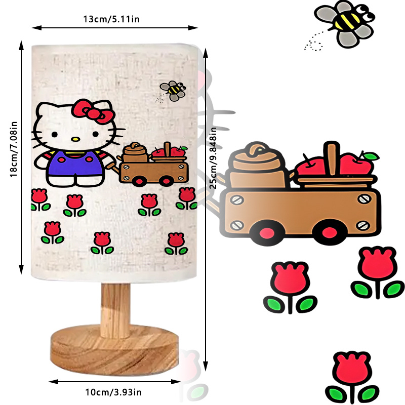 This item features a cartoon-style cat surrounded by garden-themed elements and a toy cart pattern across the shade. The light source emits a soft glow, maintaining a steady tone to complement focused settings or backgrounds. Whether placed on a table near a reading nook or part of a decorative display, it supports an inviting visual layer.