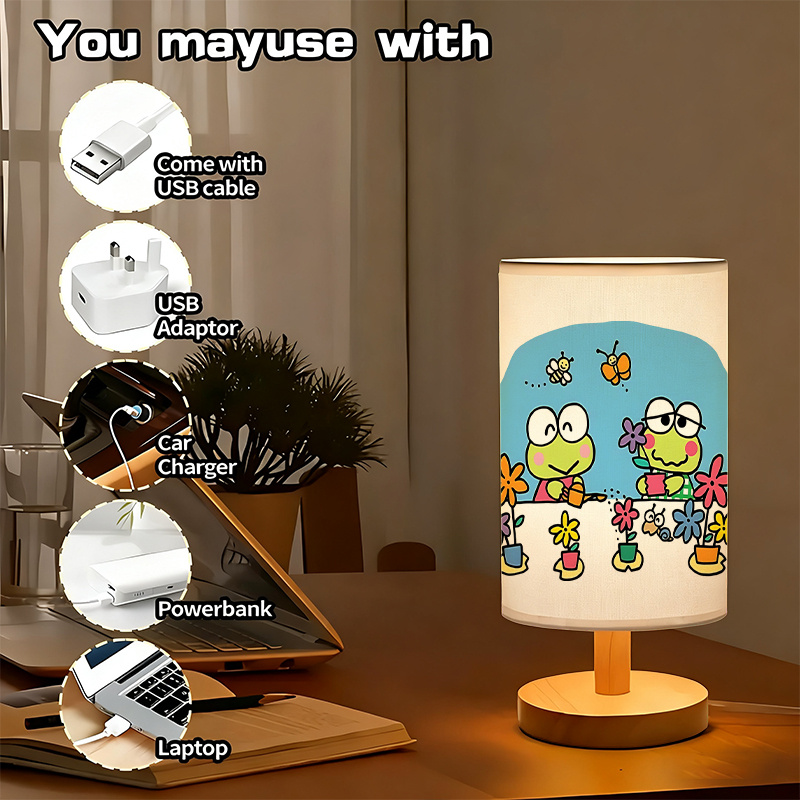 This Cartoon Frog Printed Linen Table Lamp For Decor adds charm and cozy lighting to any space. The soft fabric shade diffuses warm light gently, creating a calm and inviting atmosphere. USB power allows easy connection to adapters, laptops, or power banks, offering flexible placement options. The wooden base ensures stability while complementing the colorful artwork. Compact and lightweight, it fits perfectly on bedside tables, shelves, or desks. A fun décor piece for children’s rooms or anyone who enjoys cheerful cartoon designs.