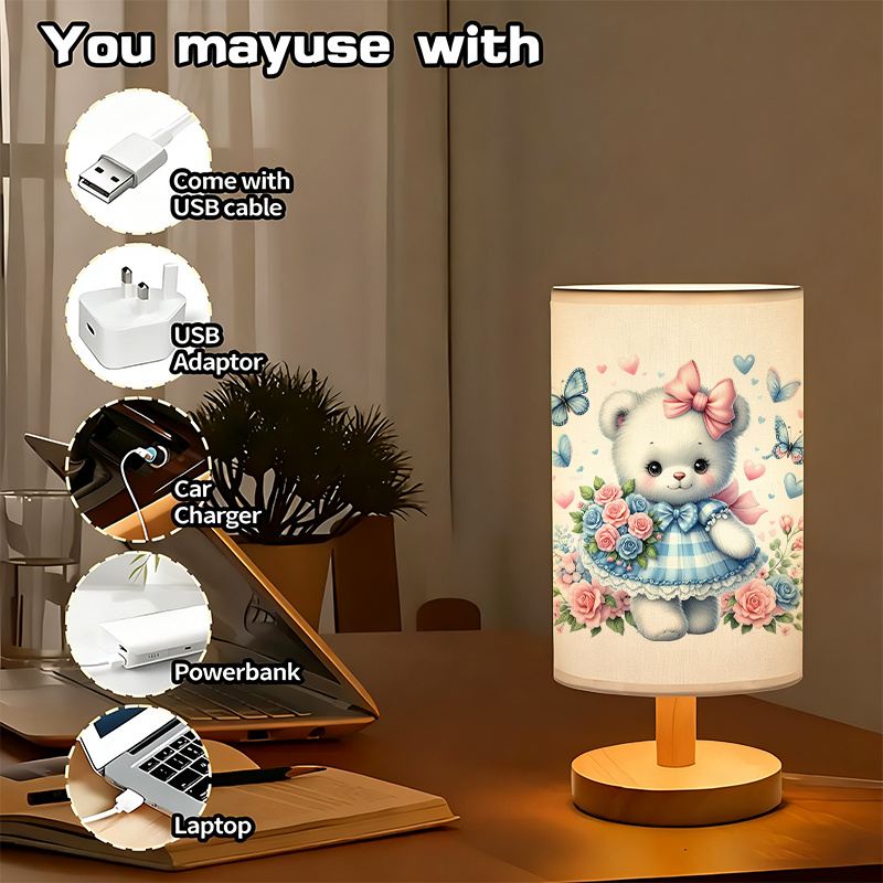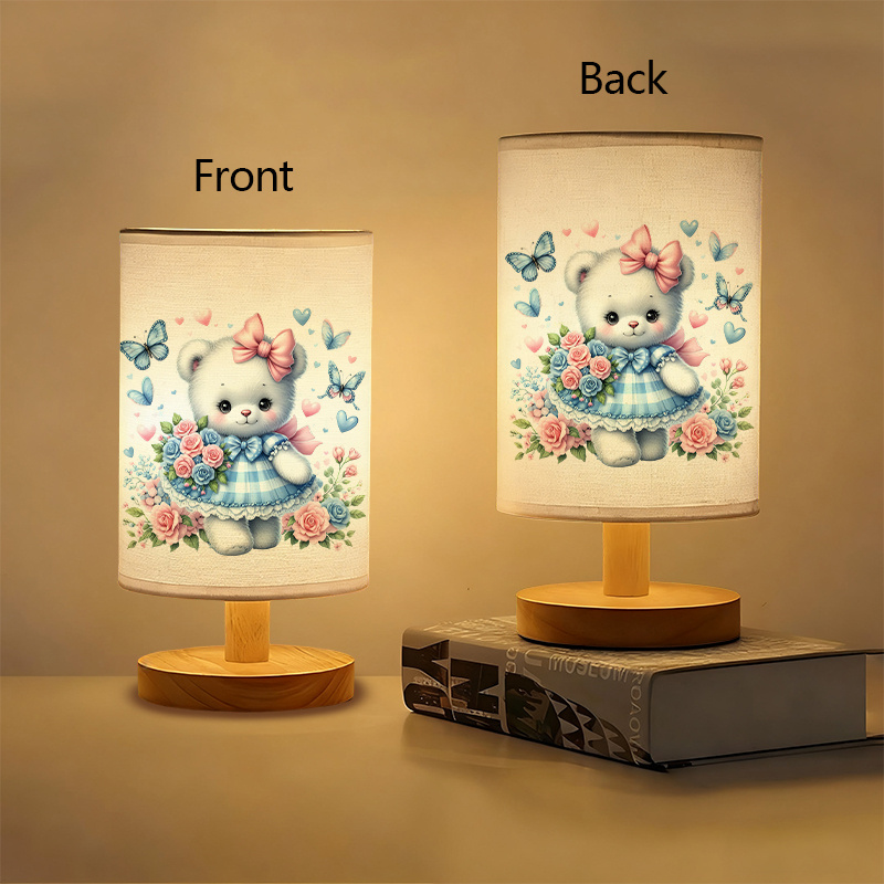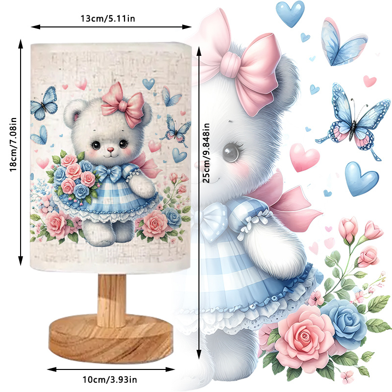 Create a peaceful space with the Cartoon Teddy Bear Floral Printed Table Lamp With Butterfly And Bow Artwork, a compact lighting option built with printed artwork and soft detailing. This table lamp includes a light source that supports different tones, combined with a printed surface featuring floral graphics, butterflies, and character-style art. Designed with a cylindrical shade and a simple wooden base, this lamp helps light up indoor spaces with minimal setup.