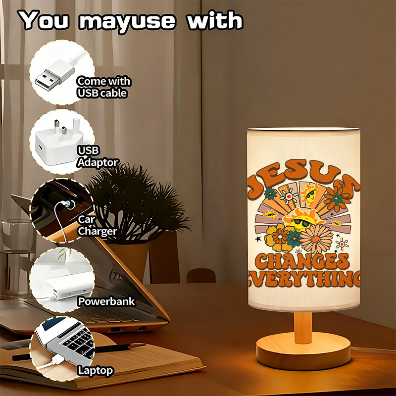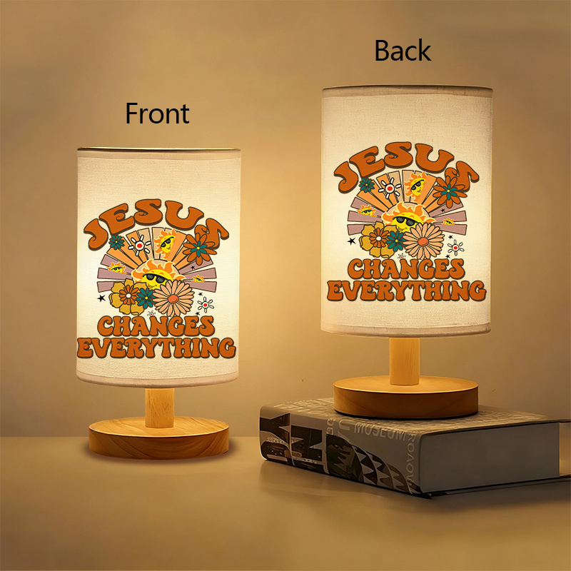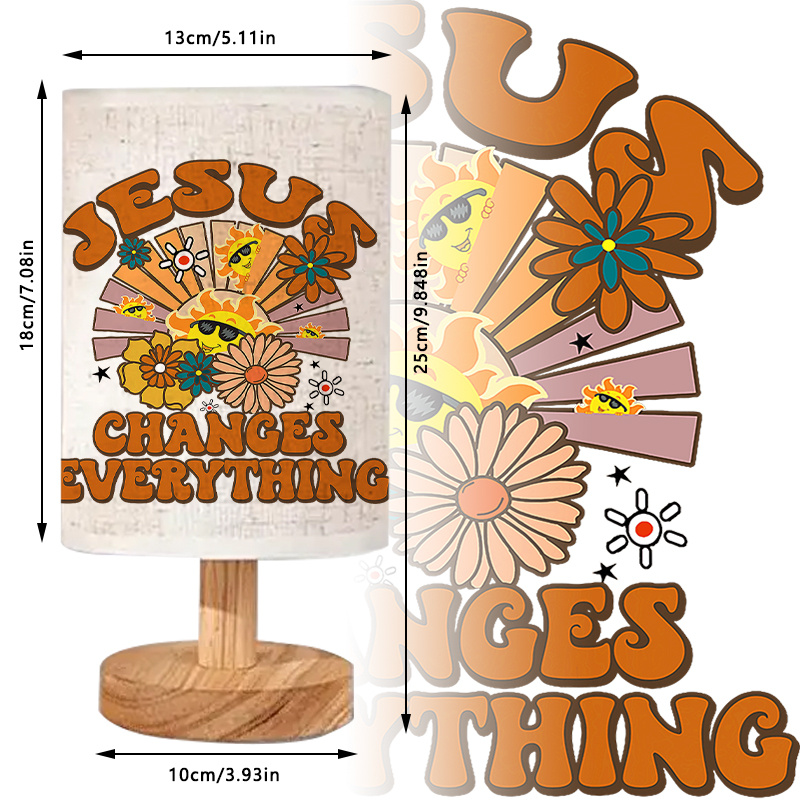 The Changes Everything Printed Bedside Glow Linen Table Lamp is a modern table lamp designed to add soft ambient lighting and a printed-shade focal point to a variety of spaces. The cylindrical linen-style shade features a bold, retro-inspired graphic layout with floral and sunburst elements and large text across the front, giving it a statement look while keeping the overall silhouette simple. This makes it a practical choice for desks, side tables, and shelves where you want lighting that also functions as a decorative accent.
