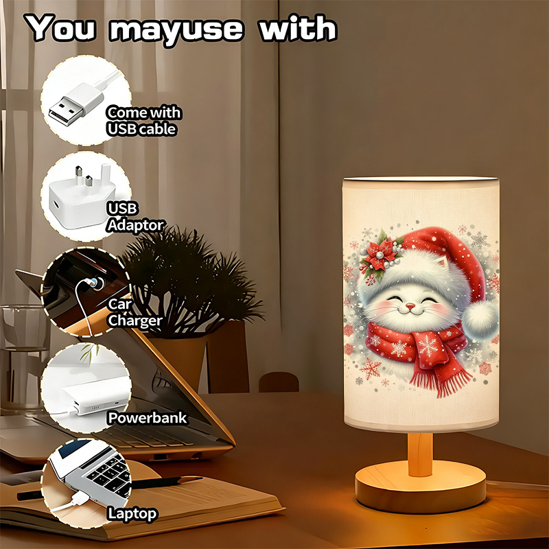The Christmas Cat Table Lamp offers themed visual design and ambient light output in a compact format. The printed shade and stable wood base form a combination for casual lighting in indoor spaces. Its USB power setup adds compatibility with common devices, making it functional in varied environments.