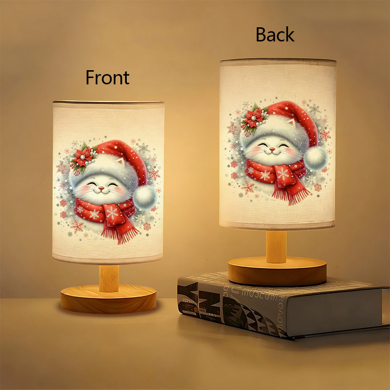 This Festive Table Light pairs with winter themes through visual design, but can also function year-round as part of novelty setups. The cat print incorporates a thematic scarf and hat illustration, alongside scattered snowflake icons. This makes it an ideal addition to seasonal collections, themed shelves, or creative desk arrangements.