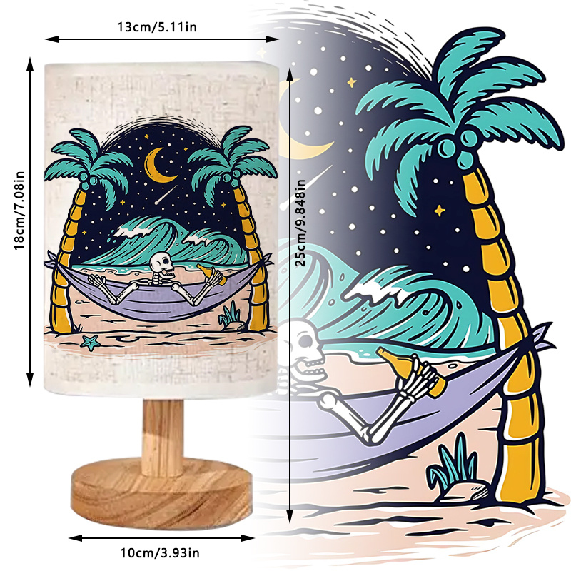 Bring a calm and scenic element into your space with the Coastal Hammock Scene Printed Table Lamp With Cylindrical Shade. Featuring an illustration of palm trees, a hammock, a crescent moon, and a shoreline under a star-lit sky, this piece serves both as lighting and as decorative art. The visual composition is printed directly on the cylindrical shade, allowing soft light to diffuse through the surface.