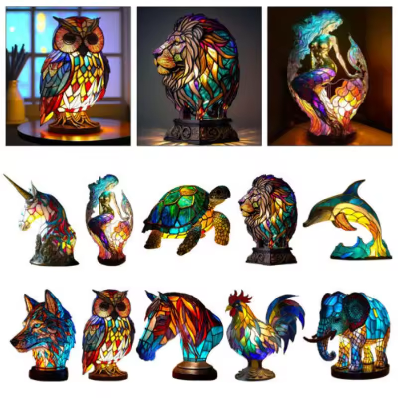 The Colorful Elephant Mosaic Design Stained Glass Table Lamp brings decorative lighting and artistic presence into indoor spaces. Crafted from stained resin, this animal table lamp is designed to function as both a night light and a display piece. Its compact size allows easy placement on tables, desks, shelves, and decorative surfaces. The lamp provides gentle illumination suitable for evening and low-light environments. Designed for indoor use, it supports a warm and visually engaging lighting effect.