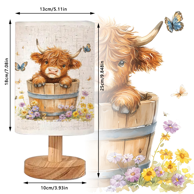 The Cow In A Bucket Printed Linen Bedside Table Lamp is a charming lighting solution designed to bring warmth, character, and visual interest into indoor spaces. Featuring a detailed cow illustration printed on a linen-style shade, this lamp is paired with a smooth wooden base that complements both modern and rustic interiors. Its compact size makes it well-suited for bedside tables, desks, shelves, or reading corners where gentle illumination is preferred.