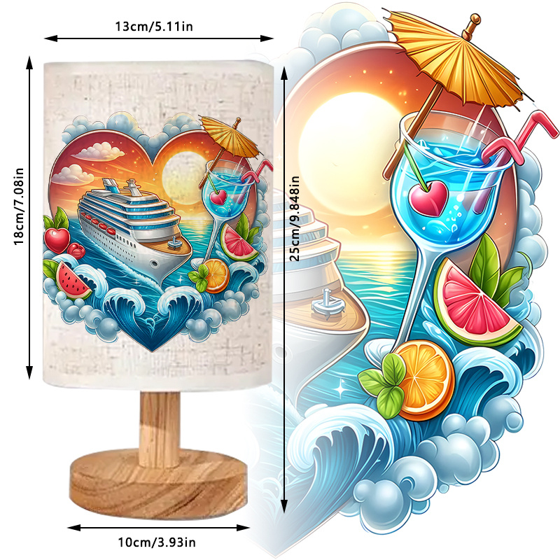 The printed shade includes elements such as a ship on the water, fruit illustrations, umbrella-style drinks, and a stylized horizon. These elements combine to form a scene reminiscent of scenic destinations. With soft light output and a compact format, the lamp suits both decorative and daily-use purposes.