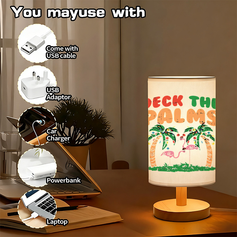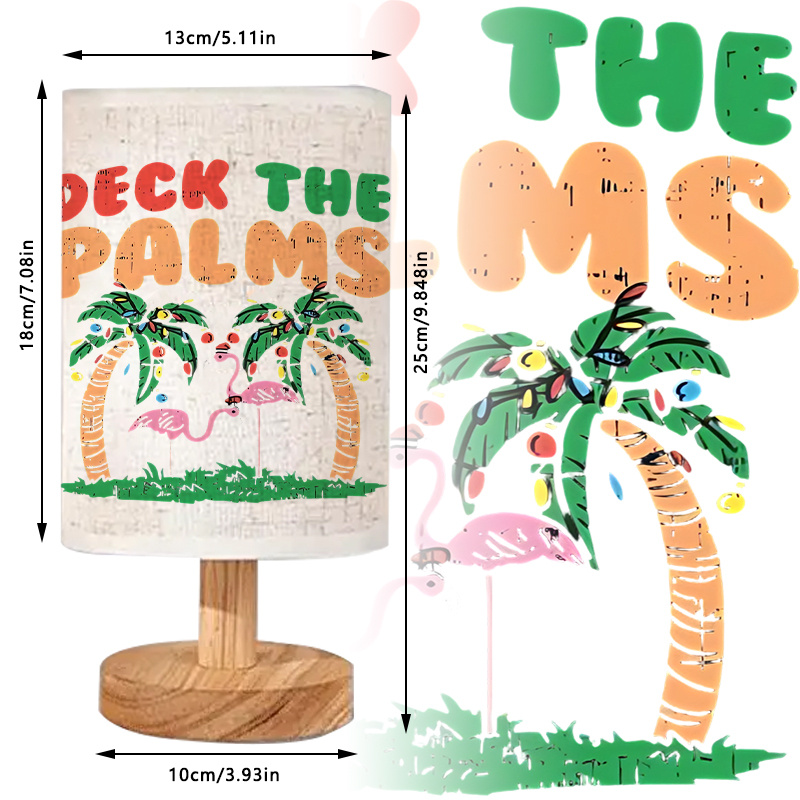 The Deck The Palms Printed Linen Table Lamp is an indoor lighting accent designed to bring a tropical holiday theme into modern home décor. The linen-style fabric shade features the phrase “Deck The Palms” with palm trees and a flamingo illustration, blending seasonal wording with a coastal-inspired look. This lamp is a practical option for rooms that need a compact light source while also adding a decorative element that stands out on a side table, desk, shelf, or console. Its wood-toned base and simple cylindrical shade shape work well with many interiors, including neutral bedrooms, living rooms, and workspaces.