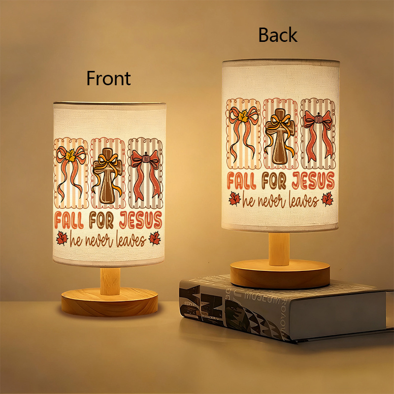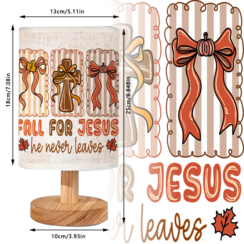 This Decorative Table Lamp With Autumn Bow Artwork Print With Wooden Base adds a visual highlight to indoor setups through its cylindrical printed shade and clean wood base. The artwork presents a vertical panel style featuring seasonal bow graphics, making the lamp suitable for rooms that benefit from structured accent lighting.