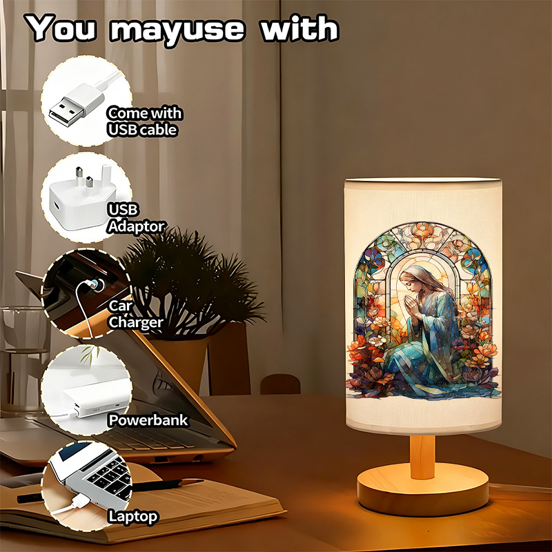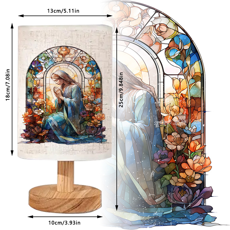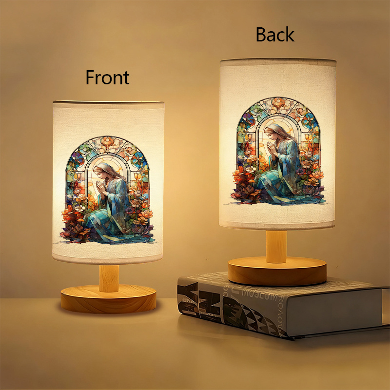 The Decorative Prayer Artwork Inspired Table Lamp with Wooden Base brings together visual design and function. This tabletop piece features a printed fabric shade inspired by stained glass illustrations. It rests on a structured wood base and emits a soft, warm glow that enhances ambient surroundings.