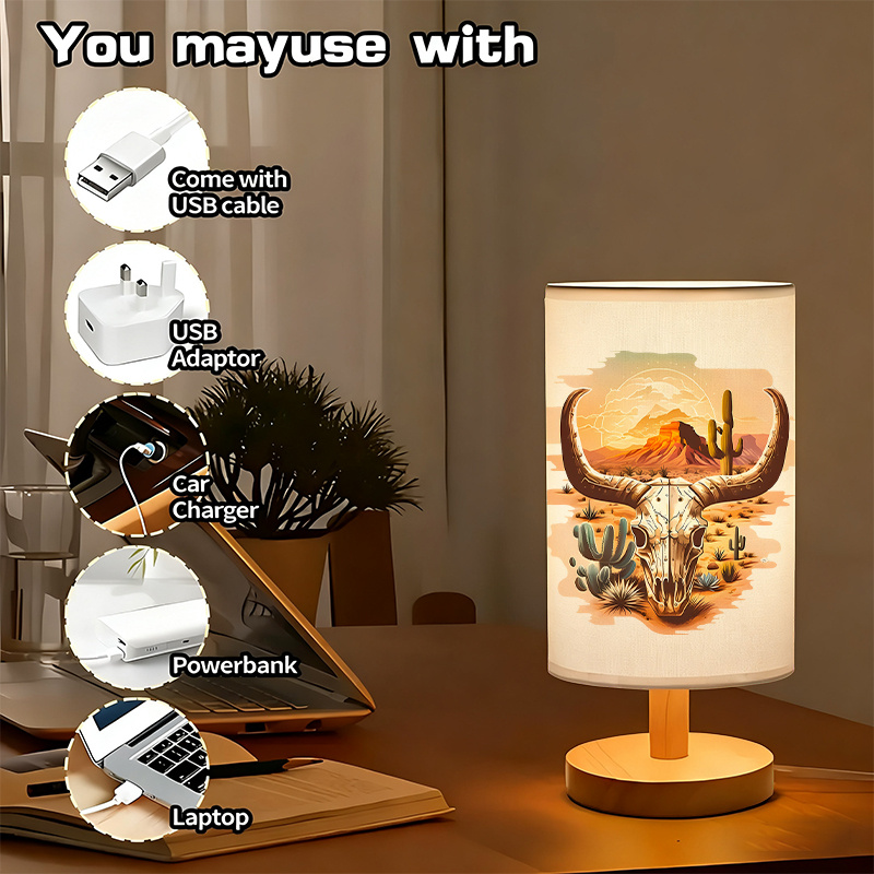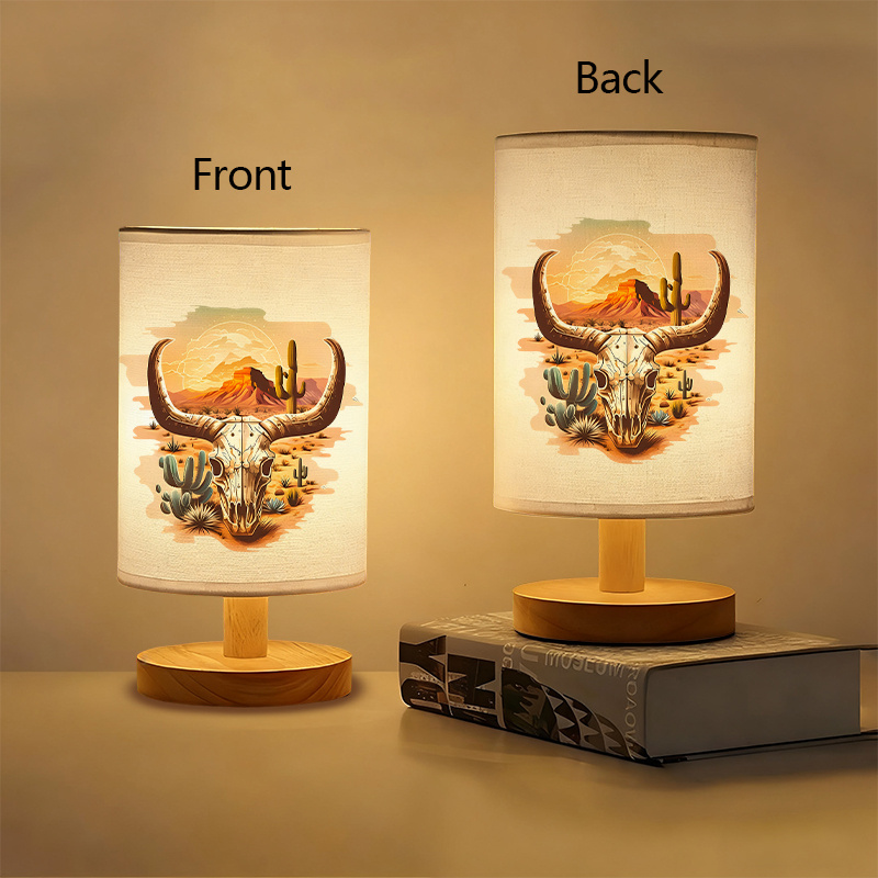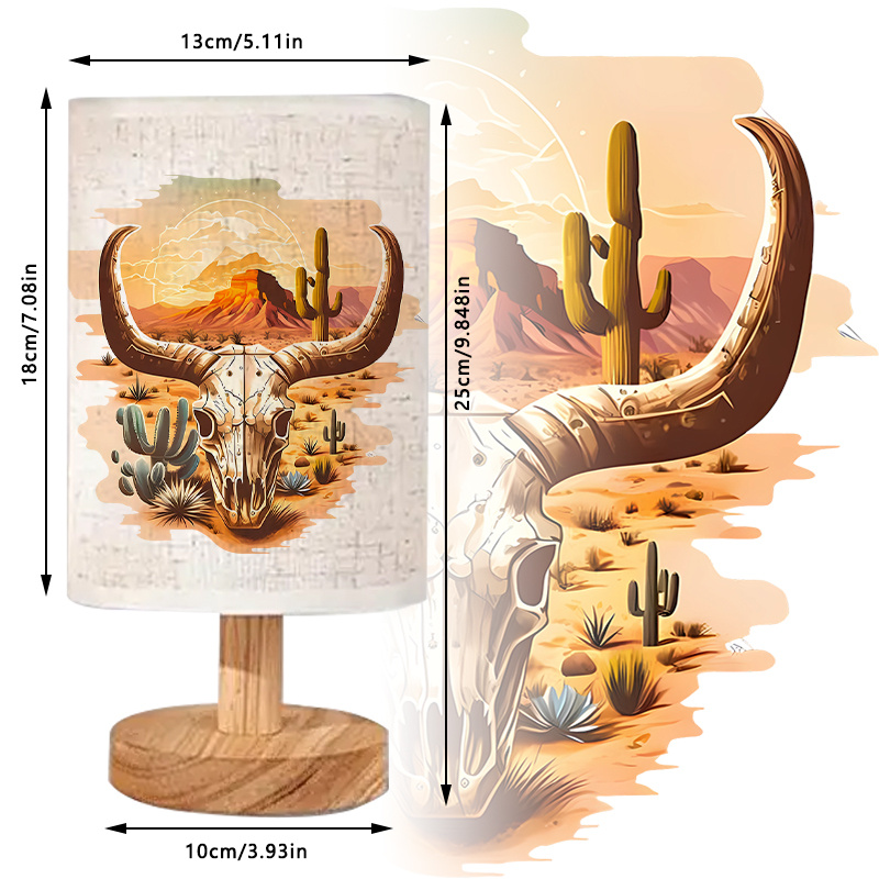The Desert Theme Rustic Bull Design Linen Table Lamp combines rustic charm with Western desert inspiration. Featuring a bull design with cactus and desert elements, this linen table lamp brings warmth and style to any room. Ideal for rustic, Southwestern, and desert-themed homes, it offers both decoration and functional lighting. USB-powered and energy-efficient, this lamp fits perfectly on tables, nightstands, or desks.