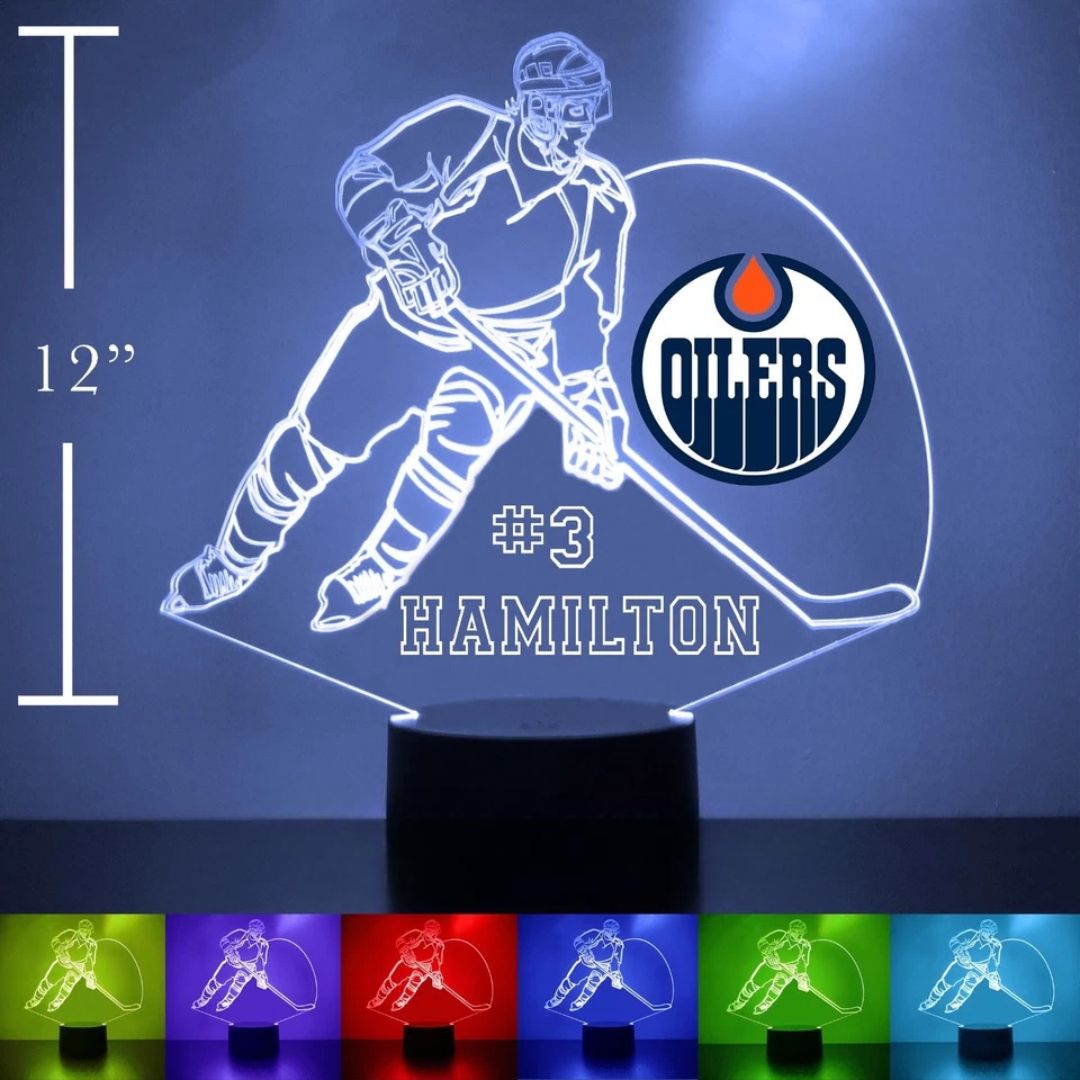 The Edmonton Oilers Personalized Hockey Player Acrylic LED Lamp combines an engraved skating player design with LED illumination and a personalized name-and-number layout. Designed for indoor display, it suits desks, shelves, and sports-themed spaces while keeping a clean and structured presentation. With its clear acrylic panel, stable base, and multi-mode lighting, it provides a hockey-focused display piece that can be tailored to the person it represents.