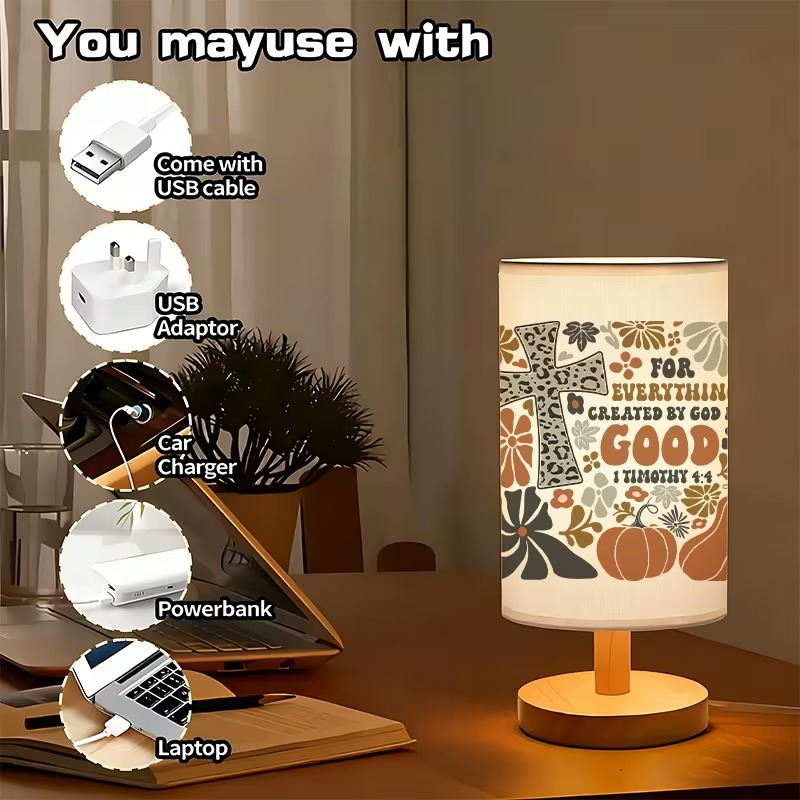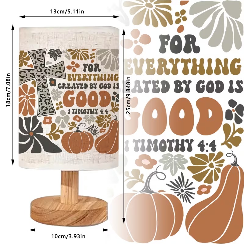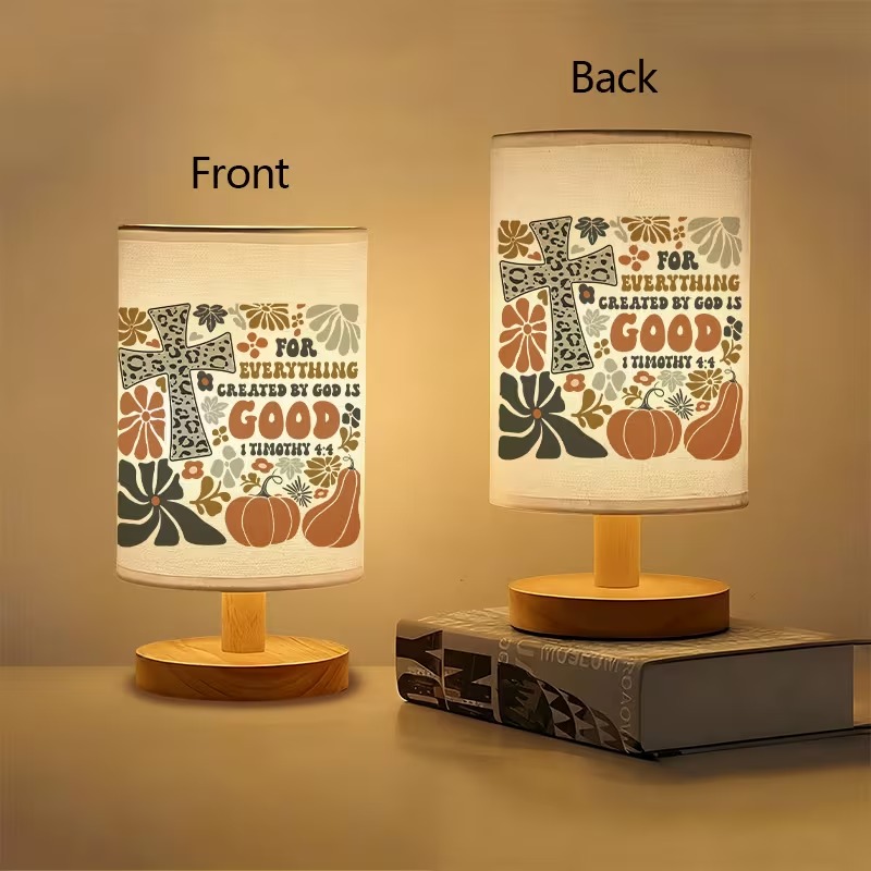 This product is designed around its central message: “For everything created by God is good.” The message sits at the center of the lamp shade, surrounded by subtle fall-themed visuals such as leaves, pumpkins, and natural symbols. The presentation aligns with seasonal decor while keeping a timeless message at its core.