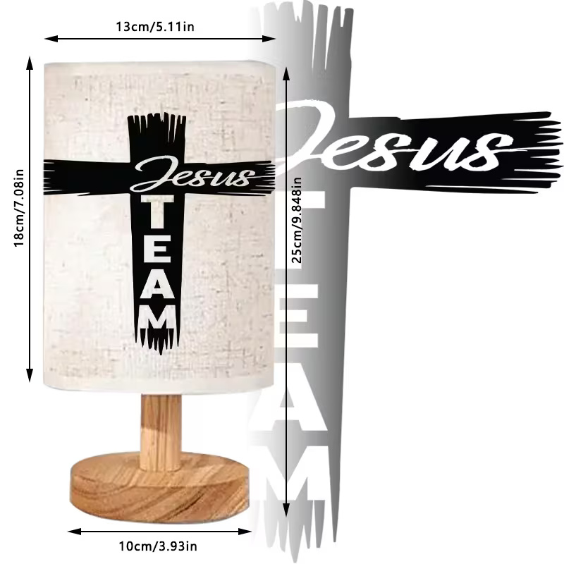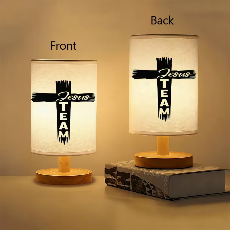 The Faith Inspired Linen Table Lamp With Cross Design features a bold cross design with the message "Jesus Team." USB-powered, this modern lamp is perfect for Christian homes, prayer rooms, or offices. The soft linen shade provides a warm light, while the wooden base offers stability and style. It's an ideal addition to any room, combining faith-based inspiration with functional lighting.