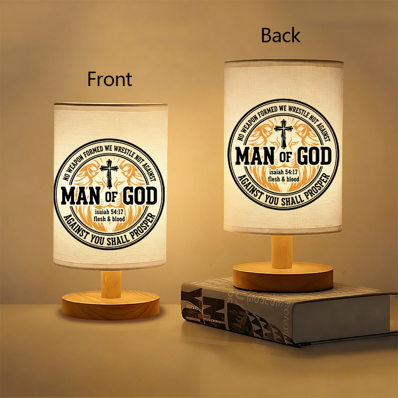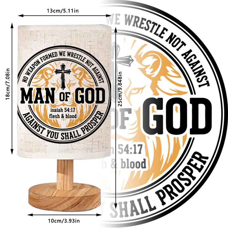 Create a meaningful atmosphere in your space with the Faith Inspired USB Linen Table Lamp, a faith-inspired lighting piece designed to combine symbolism, function, and decorative appeal. This table lamp features a bold circular emblem design printed on a textured linen shade, highlighted by scripture-inspired typography and a cross-centered graphic. Paired with a smooth wooden base and warm ambient illumination, it serves as both a functional lighting source and a statement décor item.