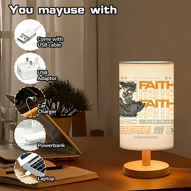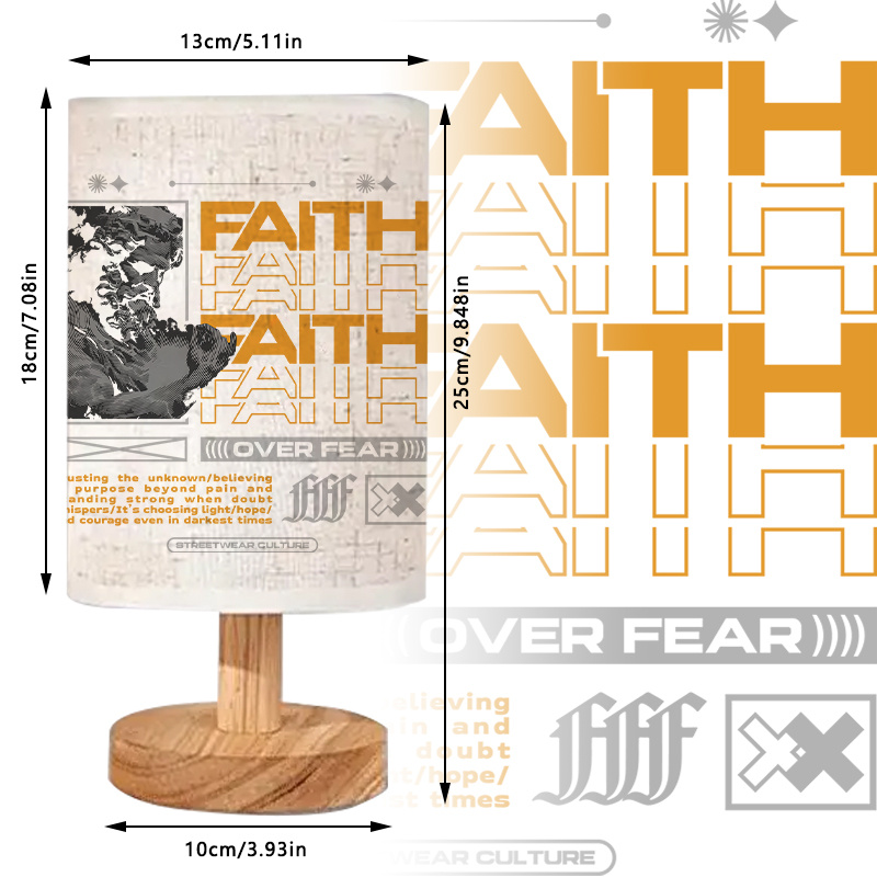 The Faith Over Fear Printed Linen Table Lamp is an indoor lighting accent that combines a modern lamp form with a bold text-based design. The linen-style fabric shade features typography artwork centered around the word “Faith,” arranged in a graphic layout that creates a strong visual statement. This style works well in contemporary interiors where clean lines, simple furniture, and printed décor pieces are used to define the space. With its cylindrical shade and wood-toned base, the lamp remains easy to place on bedside tables, desks, shelves, and console tables without taking up much room.