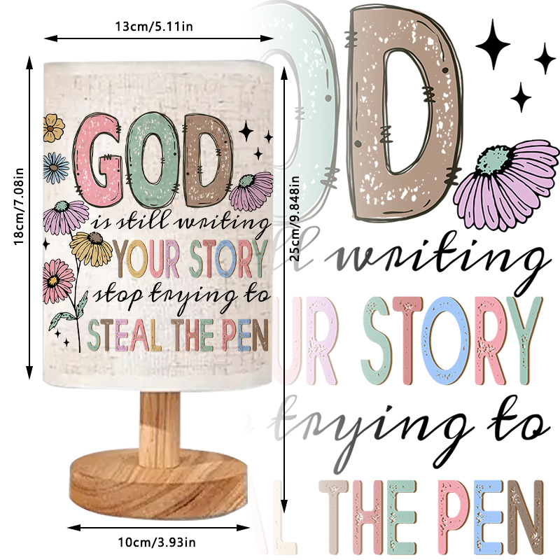 The Faith Quote Linen Table Lamp combines a linen-style fabric shade, wood-toned base, and a faith quote with floral artwork to create a decorative indoor lighting accent. With uplight illumination, push-button control, and a light source included, it fits naturally into bedrooms, living rooms, desk areas, shelves, and entryways. It provides gentle light for everyday routines while adding a message-based decorative element that complements a wide range of home décor styles.
