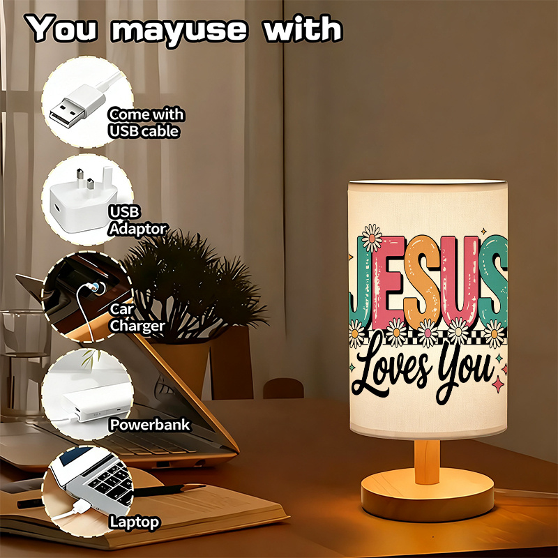 This Faith Daisy Typography Printed Linen Table Lamp offers soft ambient lighting for everyday spaces. The floral message table lamp shade adds color and meaning to décor styling. The uplight lighting method creates a gentle glow across the room. Push button control keeps operation simple and quick. USB powered setup supports easy placement in many areas. Use it in bedrooms, living rooms, dorm rooms, and study spaces for décor lighting and reading use.