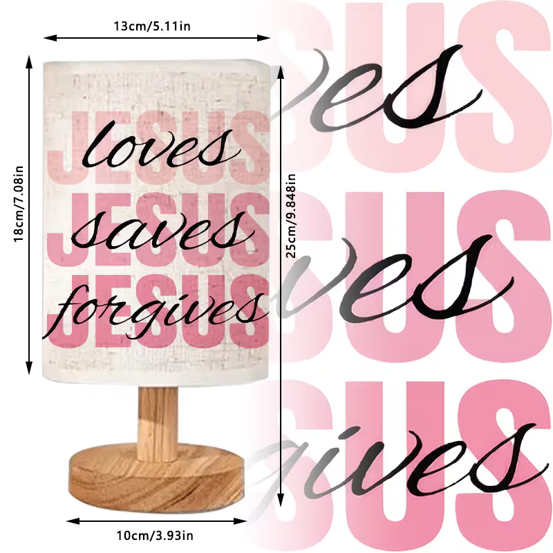 The Faith Themed Linen Table Lamp For Home Decor features a calming message of faith with the words “Jesus saves, forgives” printed on a soft linen shade. Powered via USB, this lamp offers both aesthetic and functional worth, making it a perfect addition to Christian homes, prayer rooms, or as a thoughtful gift. Create a peaceful, spiritually uplifting environment with this beautifully designed lamp.