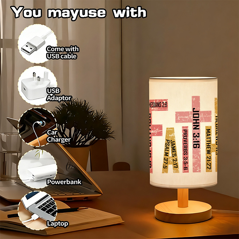 The Faith Scripture Table Lamp serves as a quiet visual piece designed to combine printed verses with ambient light. It fits easily into compact areas and provides a functional light source without drawing too much focus.