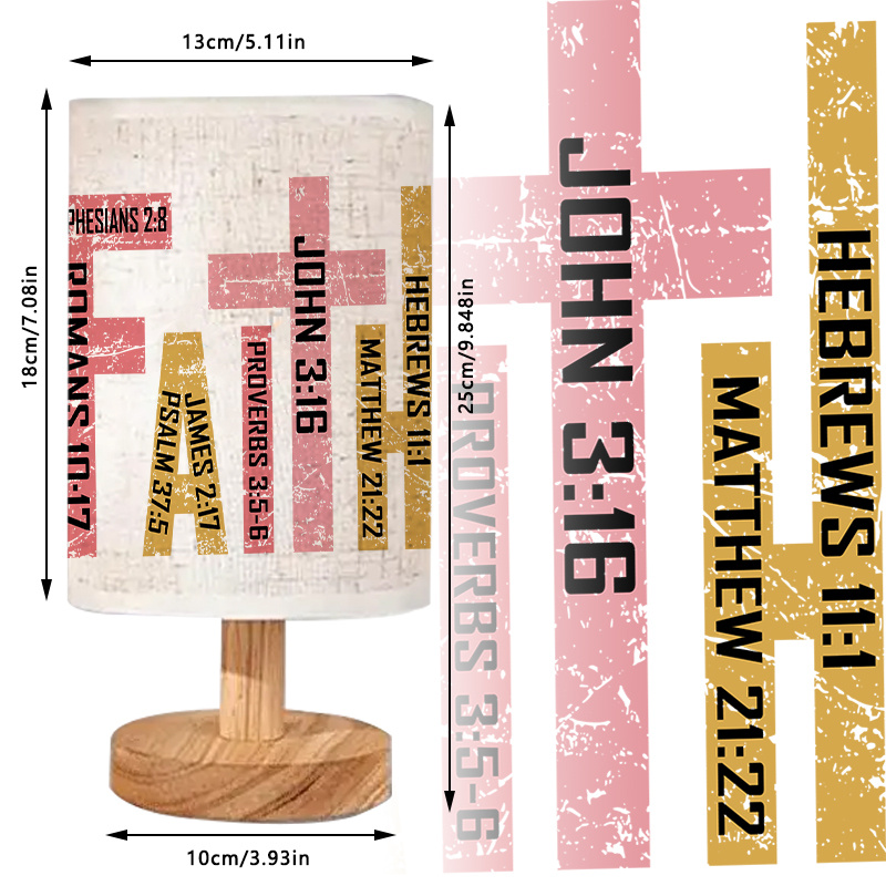 The Faith Verse Table Lamp With Scripture Print combines clean structure and spiritual inspiration into a tabletop piece designed for modern interiors. Featuring a cylindrical printed shade, the lamp displays selected scripture verses arranged in a cross pattern. When turned on, the design becomes more visible, offering a steady glow that adds presence to quiet or focused environments.