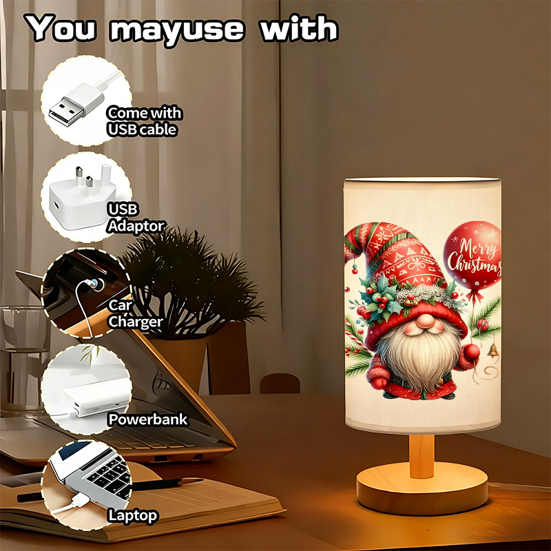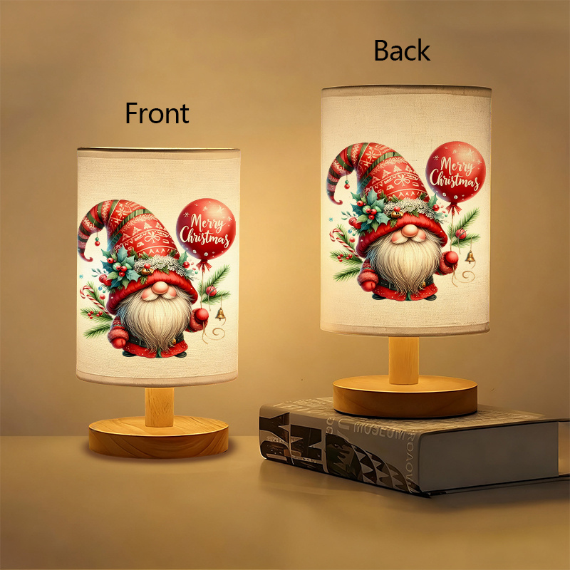 The Festive Design USB Powered Linen Table Lamp is designed to support seasonal interior arrangements while providing steady ambient lighting. Its linen-style shade, wooden base, and USB-powered design make it suitable for tables, desks, and shelves in a variety of indoor environments. The gnome-themed illustration and holiday message add visual interest while maintaining a composed and balanced appearance.