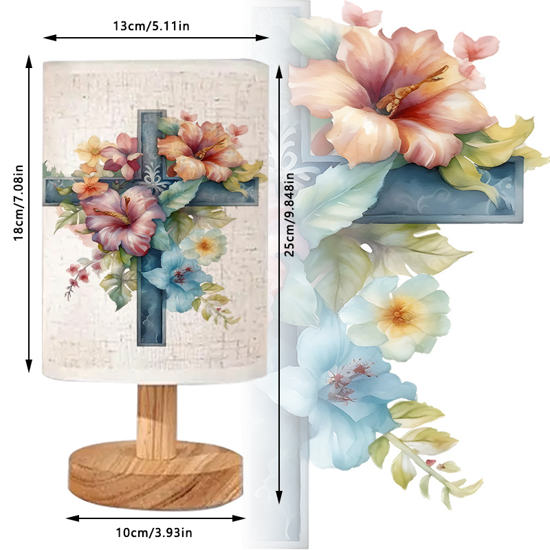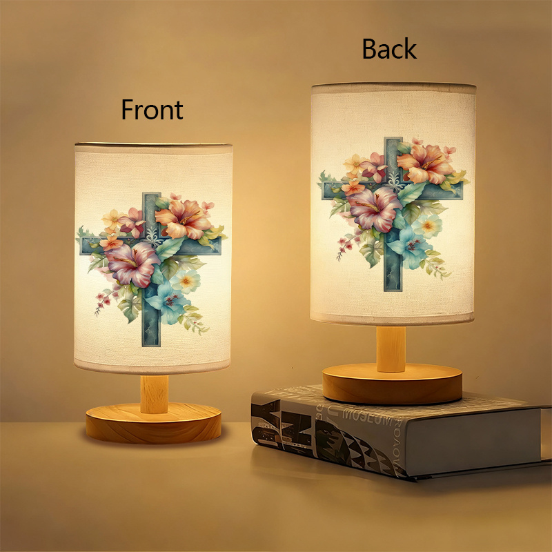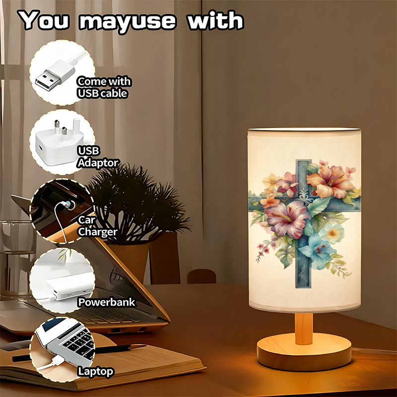 The Floral Cross Designed Linen Table Lamp is designed to provide soft indoor lighting combined with a decorative cross and floral illustration. Featuring a cylindrical linen shade and a stable wooden base, this lamp delivers warm illumination suitable for various indoor environments. The printed design remains clearly visible when the lamp is both illuminated and turned off, allowing it to function as a lighting fixture as well as a decorative accent. Its USB-powered structure supports flexible placement without dependence on fixed wall outlets.