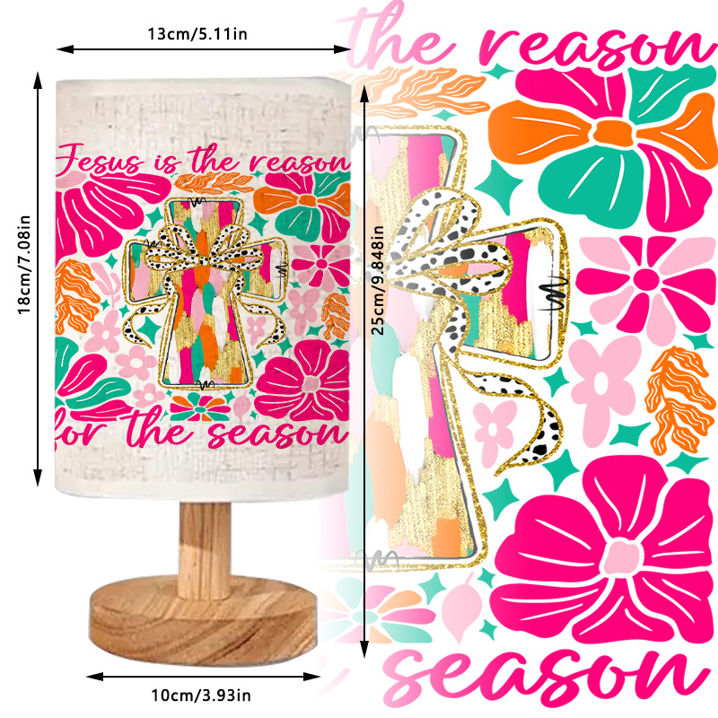 The Printed Religious Lamp displays floral imagery in coordinated tones. The center of the artwork contains a visual cross wrapped in ribbon styling, supported by floral arrangements that extend outward. These design elements complement interiors that align with message-oriented or themed visual choices.