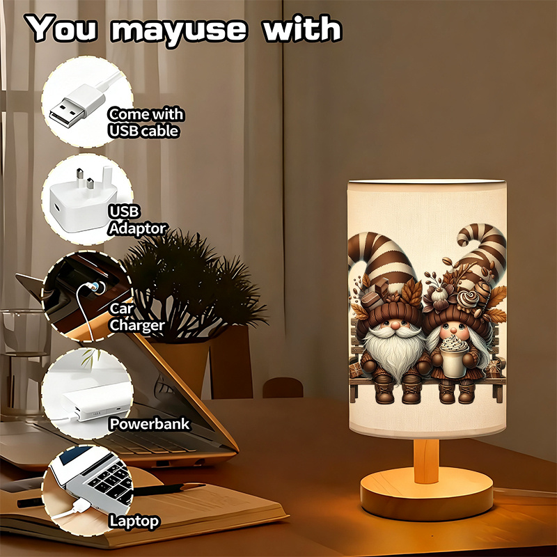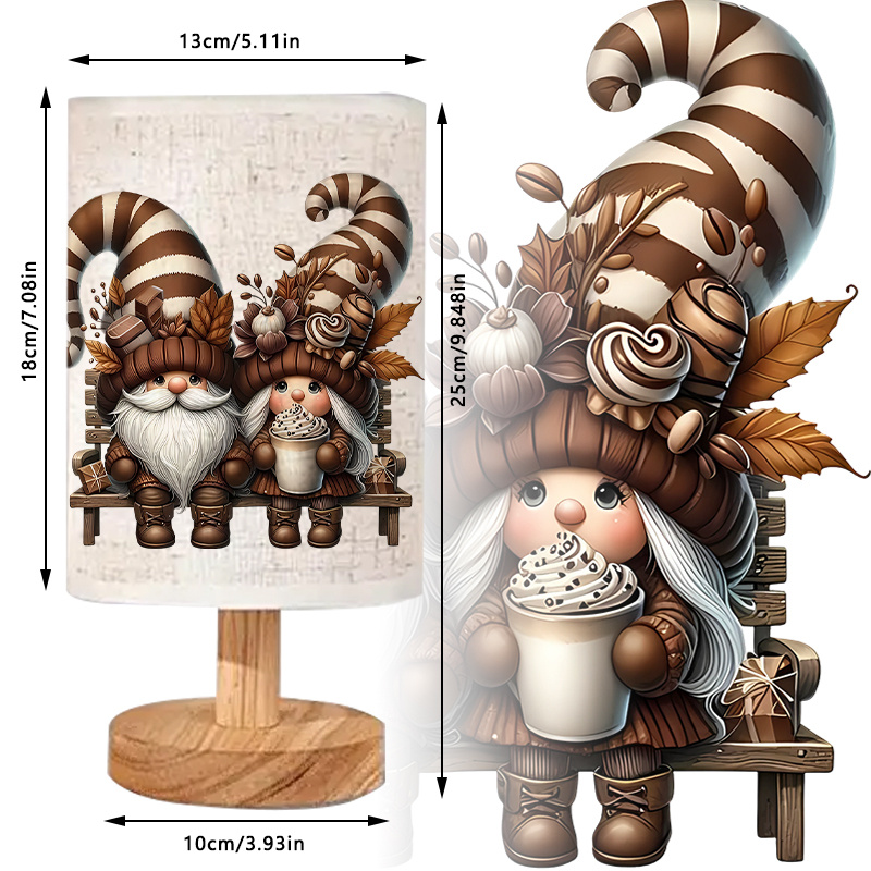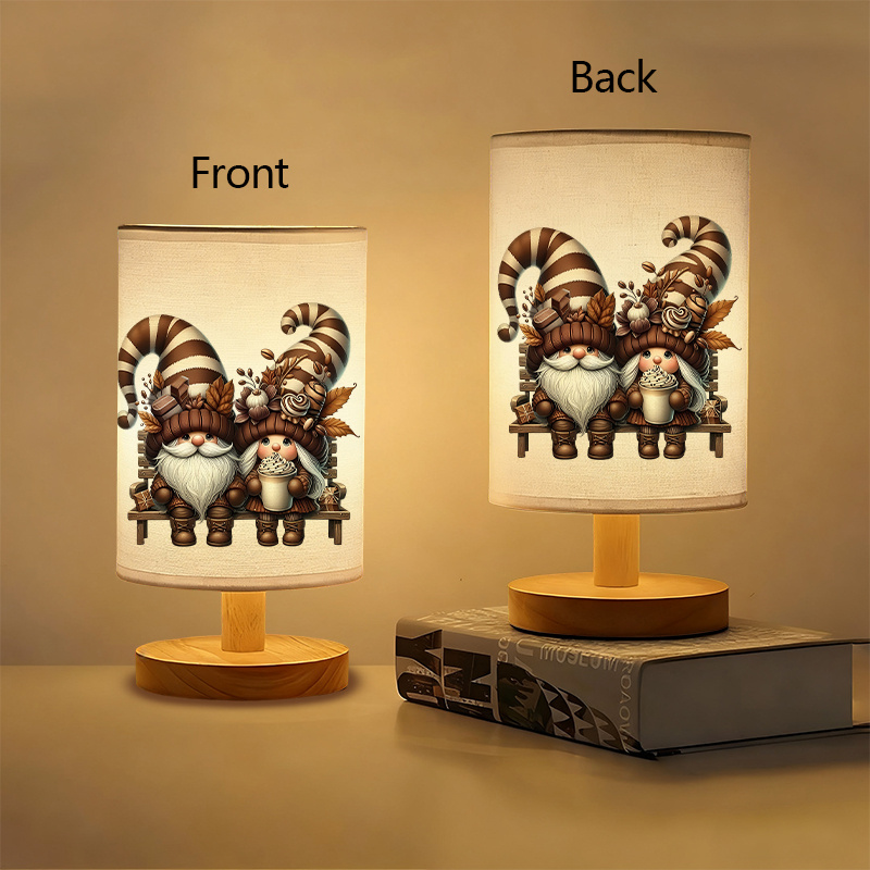The Gnome Bedside Printed Linen Table Night Lamp blends visual charm with functional lighting. This compact model includes a linen shade with detailed fall-themed illustration featuring a gnome couple enjoying coffee. Its structure is scaled for small areas like shelves, desks, and tables, while still adding a meaningful visual focal point.