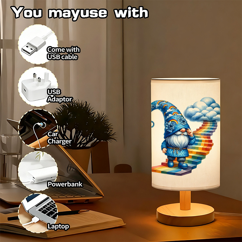 The Gnome Walking On Rainbow Stairway Themed Table Lamp is a display piece that brings artistic visuals and ambient lighting into one form. Designed for those who appreciate decor, this printed tabletop lamp features a whimsical scene of a gnome walking along a rainbow stairway into the clouds. Its visual concept blends dreamlike imagination with function.