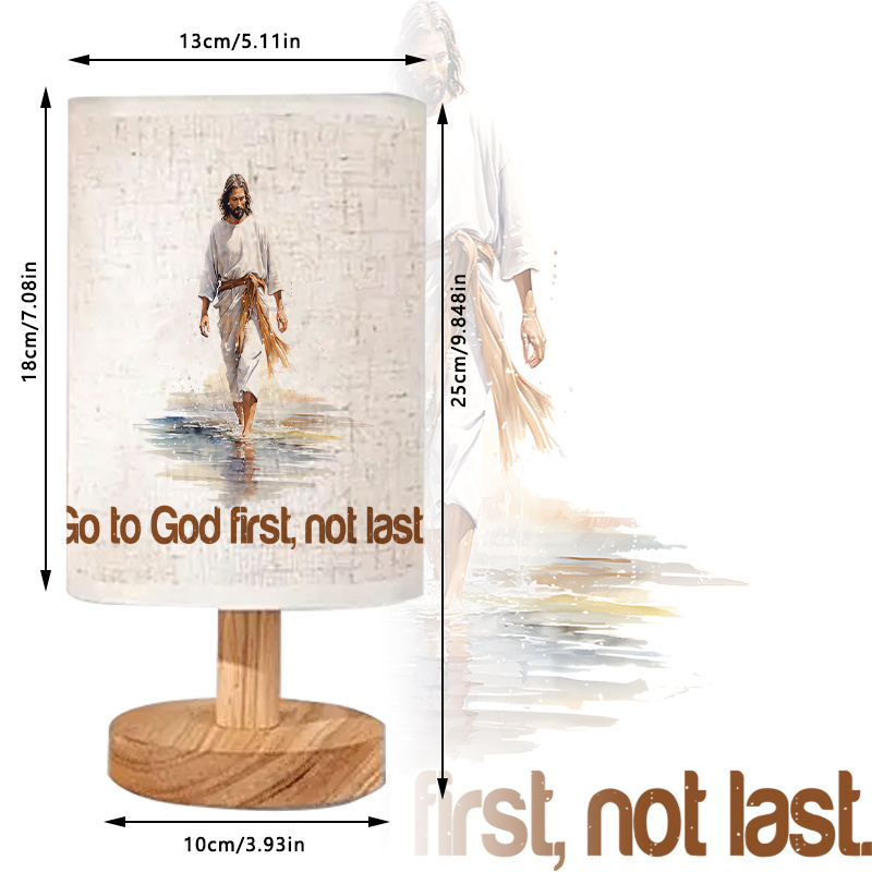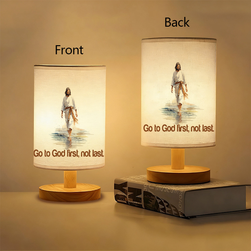 The Go To God First Not Last Printed Linen Table Lamp is an indoor lighting accent designed to combine soft illumination with a faith-themed illustrated design. The linen-style shade features a figure walking across water with quote text, creating a message-based focal point that fits well in bedrooms, living rooms, desk areas, and personal corners of the home. With a modern cylindrical shade and a wood-toned base, the lamp blends easily with many interior styles, including neutral palettes, light wood furniture, and simple décor arrangements. Its compact footprint makes it practical for placement on a bedside table, shelf, console, or desk without occupying much surface space.
