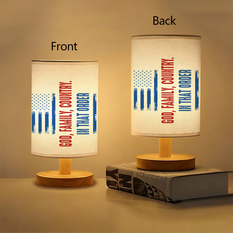 The God Family Country In That Order Printed Linen Table Lamp is an inspirational, USB-powered linen table lamp designed to add a motivating and patriotic look to your living space. The lamp is decorated with the words "God, Family, Country" in bold, colorful lettering, making it a perfect fit for anyone who cherishes these values. This modern table lamp combines functionality with a meaningful message, creating a piece of decor for your home.