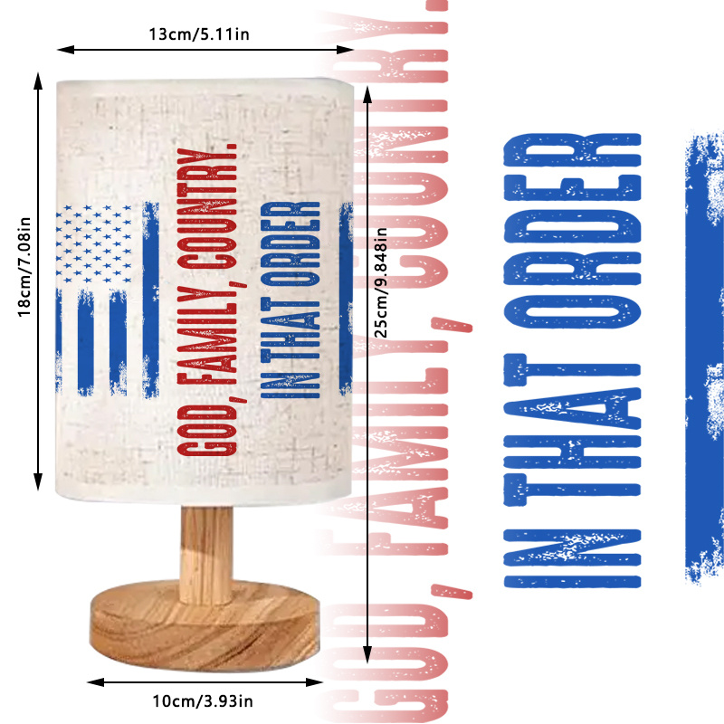 The "God Family Country Lamp" isn’t just another piece of decor – it’s a reflection of personal values and a perfect way to enhance your living space. Ideal for those who prioritize faith, family, and country, this lamp serves as a daily reminder of what matters most. The sturdy wooden base and linen shade ensure while the, vibrant design adds warmth to your home. Its USB-powered design makes it a practical choice for modern living, offering a convenient power source that fits into any environment. Whether you place it in your office, living room, or bedroom, this lamp makes a bold statement while providing the perfect amount of light. It also makes a great gift for anyone who cherishes the values represented by the lamp's message. The combination of simplicity, style, and meaning makes this lamp an excellent addition to any space.