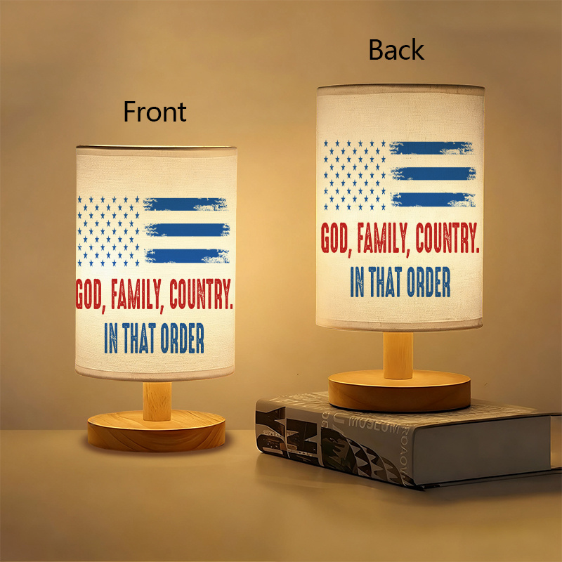 The God Family Country In That Order Printed Linen Table Lamp For Decor is a decorative table lamp designed to combine soft ambient lighting with a values-inspired message. Featuring a flag graphic and the phrase “Family, Country. In That Order,” this lamp reflects tradition, unity, and personal belief through a clean and balanced design. The linen-style shade allows light to pass through gently, creating a warm glow while keeping the printed artwork clearly visible. Finished with a wooden base, this lamp is well-suited for everyday use across a variety of indoor spaces.