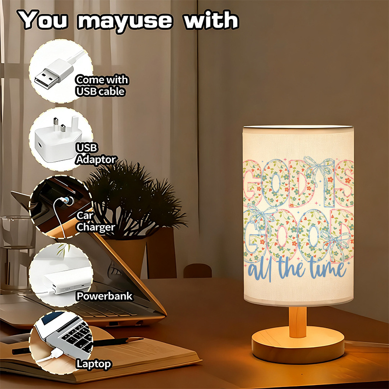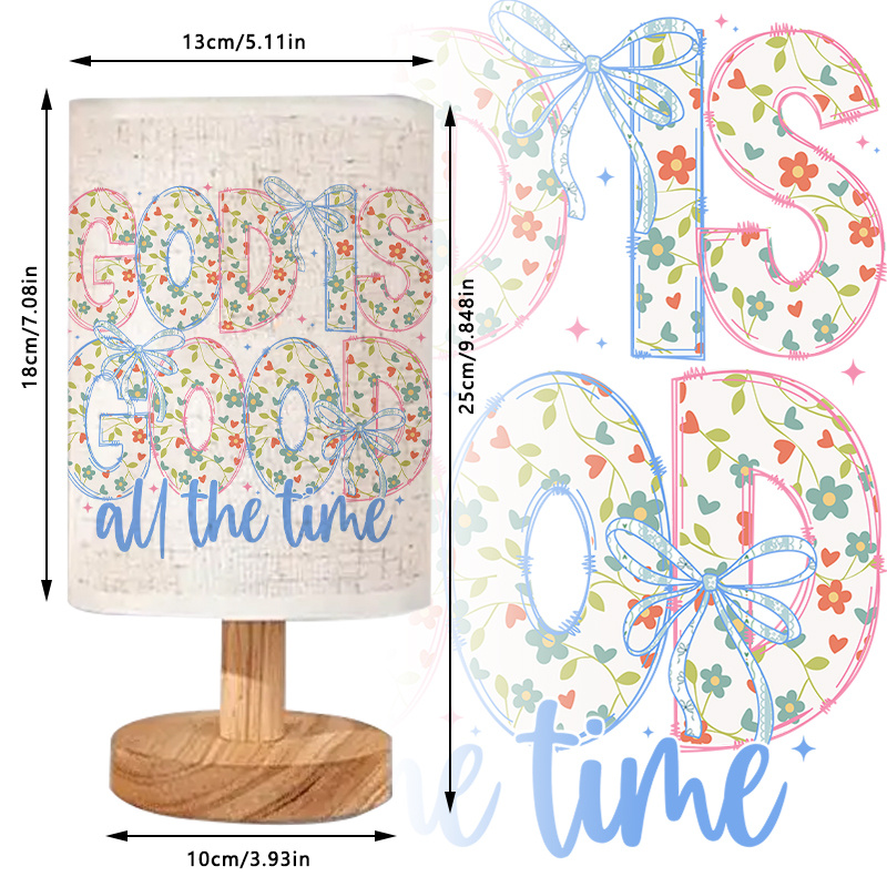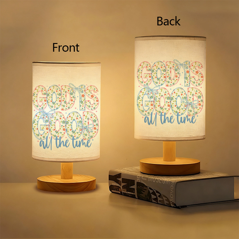 This God Is Good All The Time Message Printed Table Lamp presents a clear and structured design centered around an inspirational quote. The message reads “God's Good All The Time,” printed in stylized floral lettering that stands out against a cylindrical fabric shade. This format makes it suitable for daily environments that favor simplicity and quiet focus.