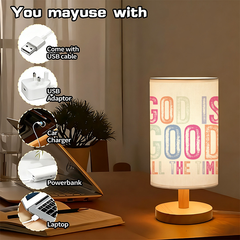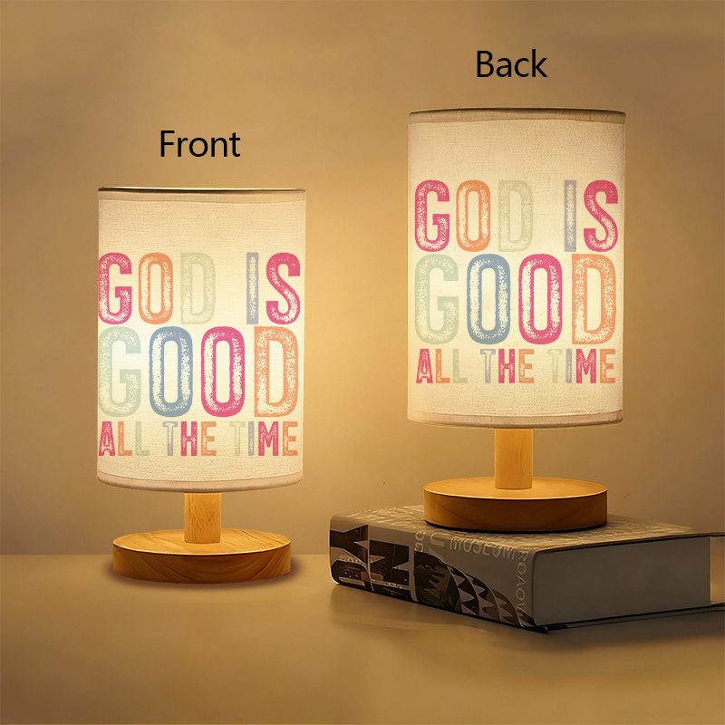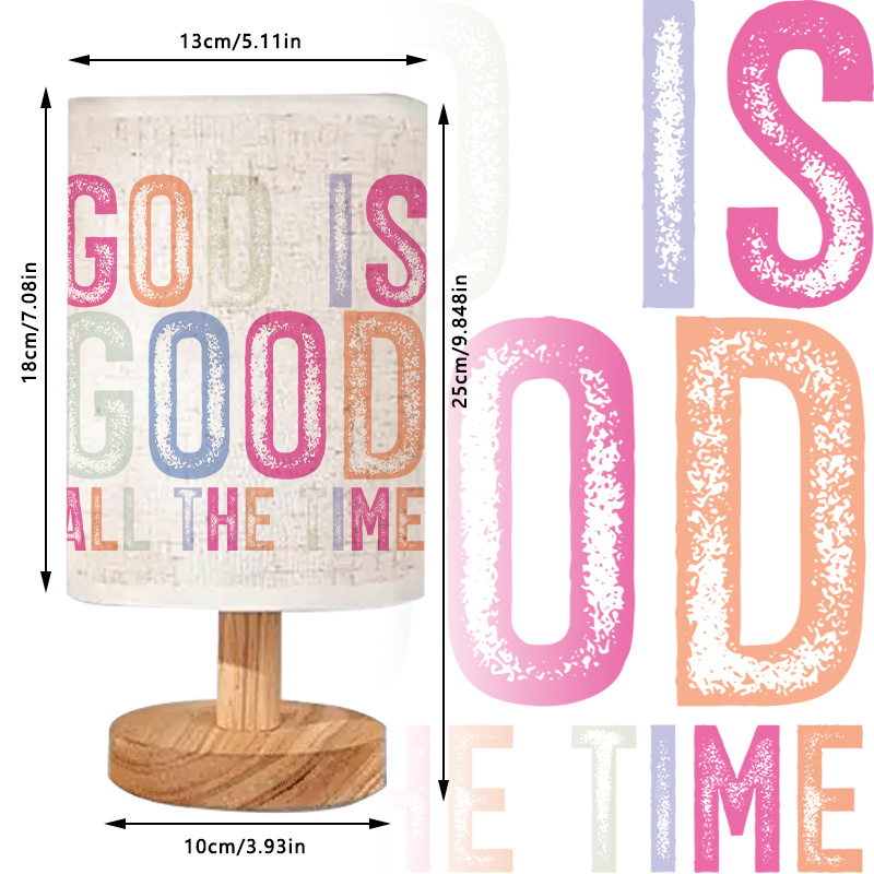 A compact table lighting option featuring a clear message and stable wood base. This God Is Good All The Time Message Printed Table Lamp With Wooden Base provides ambient lighting for small areas, adding presence through structure and form. Designed for tabletop or shelf placement, it offers a message display with dual-sided visibility.