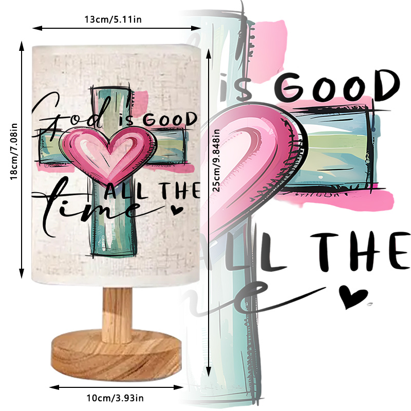 The God Is Good All The Time Printed Linen Table Lamp is a perfect blend of faith and functionality. USB powered and featuring a vibrant design with a cross motif, it serves as both a decorative piece and a reminder of God's goodness. Ideal for bedrooms, living rooms, and offices, this energy-efficient lamp offers a soft glow that adds positivity to any space. A thoughtful gift and an uplifting addition to any home.