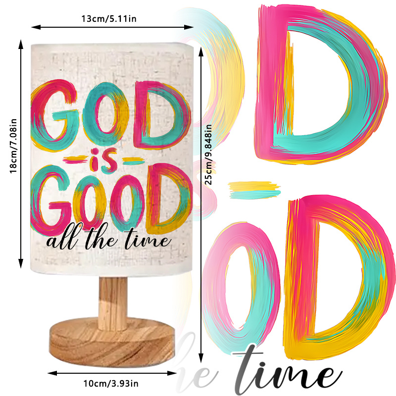- Inspirational Quote Design: The lamp features the message "God is Good all the time" in bold, vibrant colors, offering both style and positivity. This lamp serves as a constant reminder of faith and goodness.