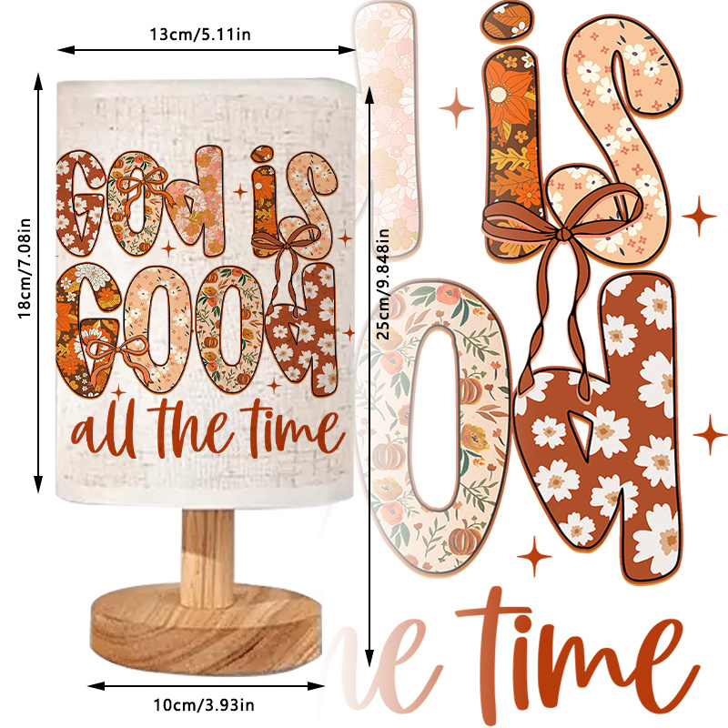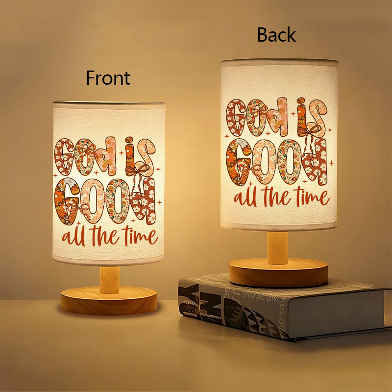 God Is Good Quote Printed Linen Table Lamp is a modern tabletop lighting piece with a printed quote design shown in the image. The cylindrical linen shade features large letter styling with patterned fill and the phrase “God Is Good all the time,” creating a clear décor focus for a desk, side table, shelf, or nightstand. The lamp’s compact footprint makes it easy to place in smaller spaces, while the upright shade format keeps the printed artwork visible from multiple angles.